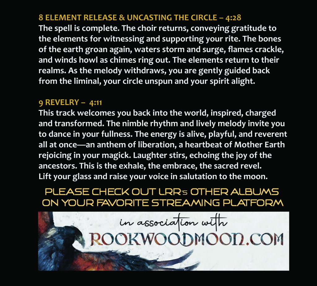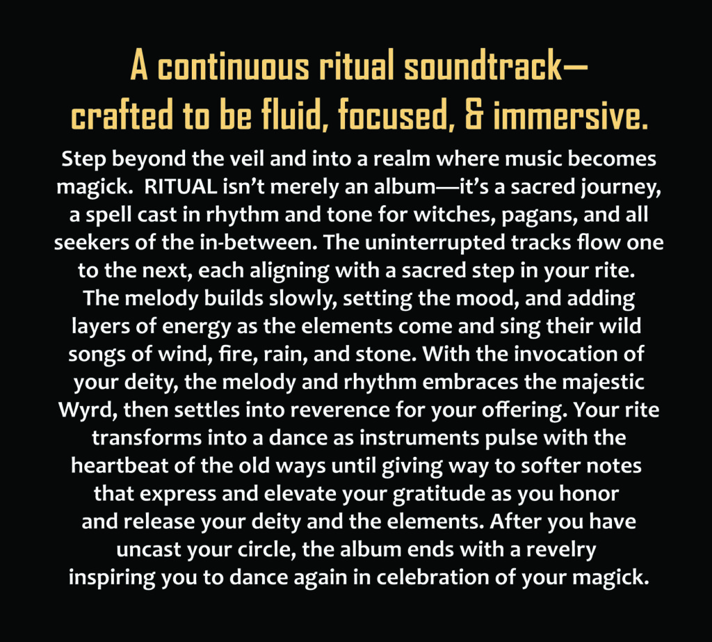 Step beyond the veil and into a realm where music becomes magick.  RITUAL isn’t merely an album—it’s a sacred journey, a spell cast in rhythm and tone for witches, pagans, and all seekers of the in-between. The uninterrupted tracks flow one to the next, each aligning with a sacred step in your rite. The melody builds slowly, setting the mood, and adding layers of energy as the elements come and sing their wild songs of wind, fire, rain, and stone. With the invocation of your deity, the melody and rhythm embraces the majestic Wyrd, then settles into reverence for your offering. Your rite transforms into a dance as instruments pulse with the heartbeat of the old ways until giving way to softer notes that express and elevate your gratitude as you honor and release your deity and the elements. After you have uncast your circle, the album ends with a revelry inspiring you to dance again in celebration