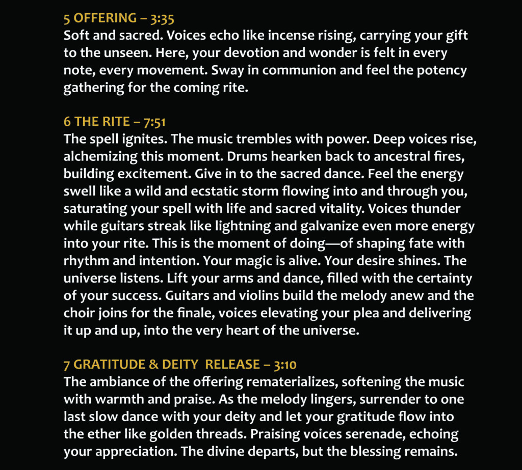 The spell ignites. The music trembles with power. Deep voices rise, alchemizing this moment. Drums hearken back to ancestral fires, building excitement. Give in to the sacred dance. Feel the energy swell like a wild and ecstatic storm flowing into and through you, saturating your spell with life and sacred vitality. Voices thunder while guitars streak like lightning and galvanize even more energy into