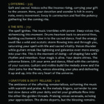 universe listens. Lift your arms and dance, filled with the certainty of your success. Guitars and violins build the melody anew and the choir joins for the finale, voices elevating your plea and delivering it up and up, into the very heart of the universe.