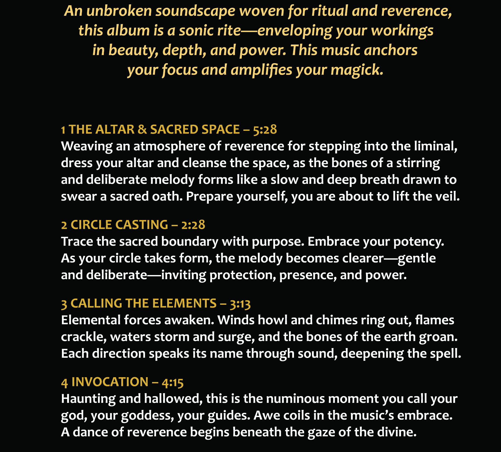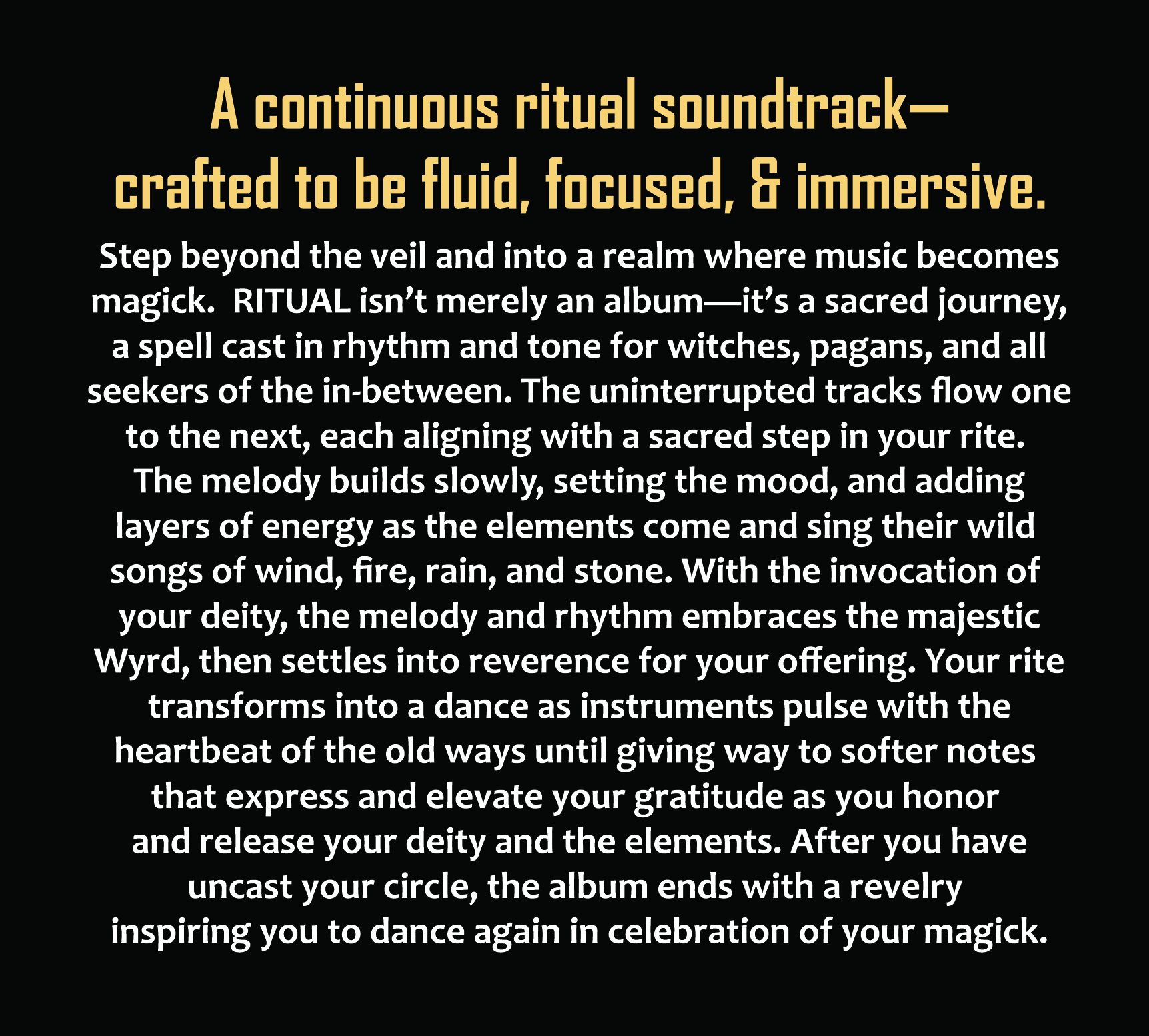 Step beyond the veil and into a realm where music becomes magick.  RITUAL isn’t merely an album—it’s a sacred journey, a spell cast in rhythm and tone for witches, pagans, and all seekers of the in-between. The uninterrupted tracks flow one to the next, each aligning with a sacred step in your rite. The melody builds slowly, setting the mood, and adding layers of energy as the elements come and sing their wild songs of wind, fire, rain, and stone. With the invocation of your deity, the melody and rhythm embraces the majestic Wyrd, then settles into reverence for your offering. Your rite transforms into a dance as instruments pulse with the heartbeat of the old ways until giving way to softer notes that express and elevate your gratitude as you honor and release your deity and the elements. After you have uncast your circle, the album ends with a revelry inspiring you to dance again in celebration
